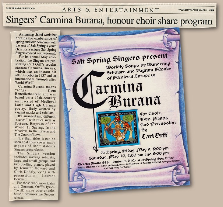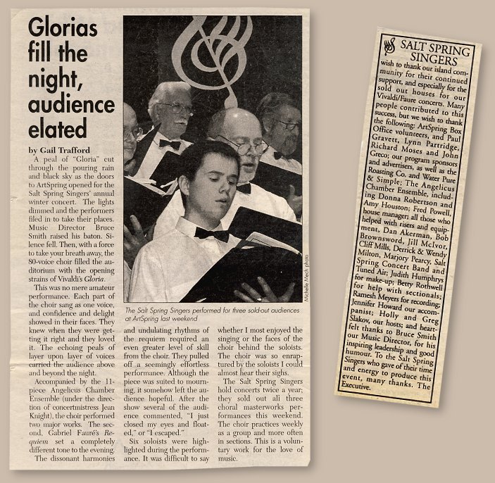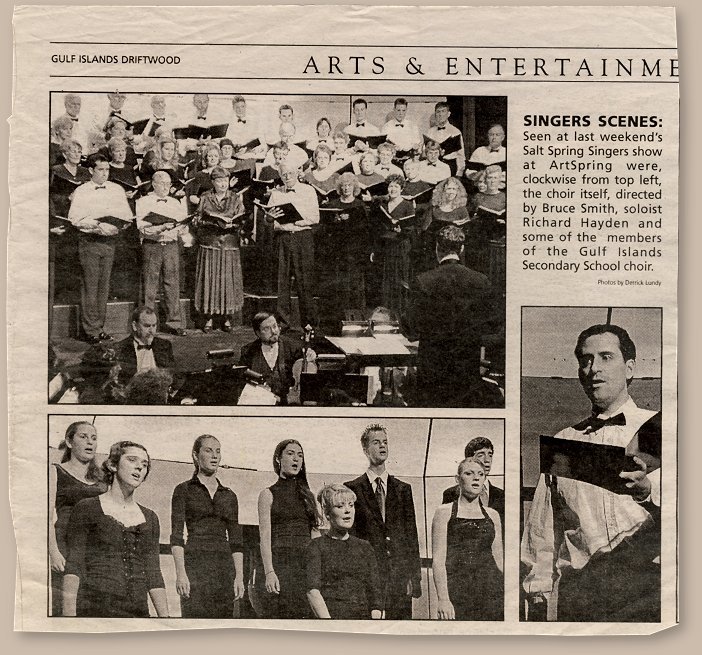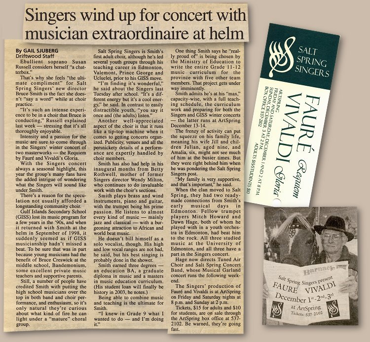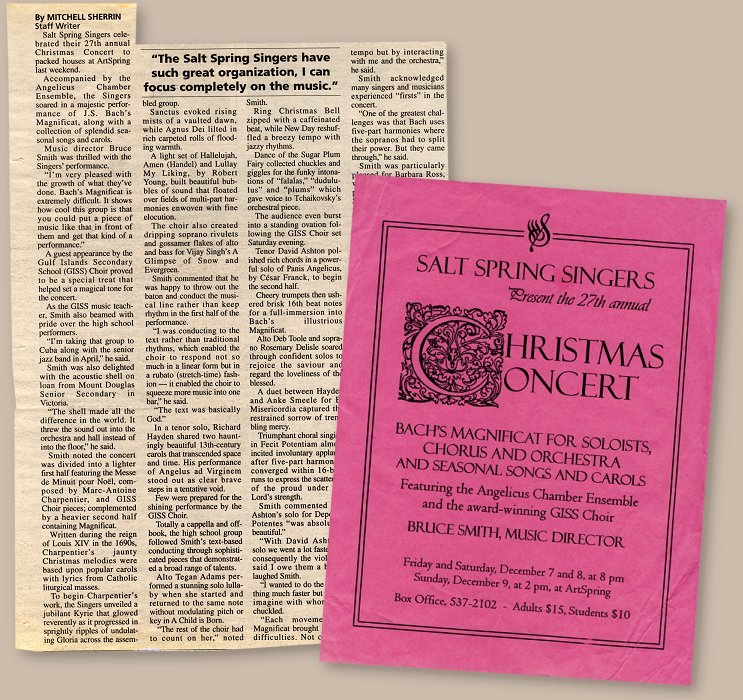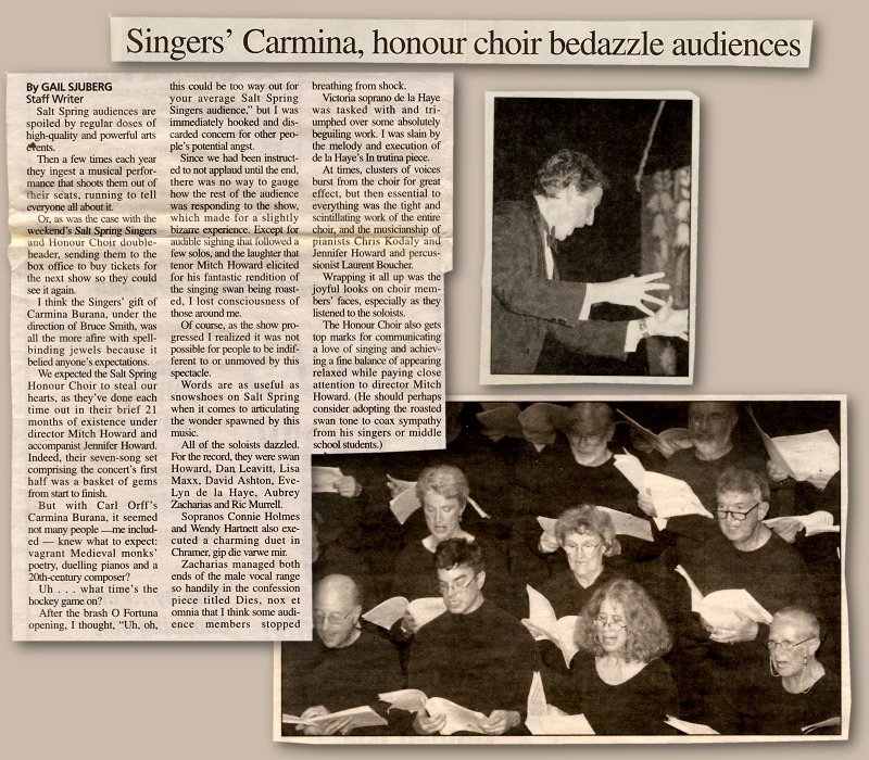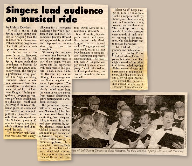 Bruce Smith came to us from the Gulf Islands High School where he taught music. Each year, he squeezed musical excellence out of the high school choir(s), and he did no less with the Salt Spring Singers. He was more demanding of us, and somehow we rose to the challenge. Musical highlights included performing Faure’s Requiem, and Karl Orff’s Carmina Burana.
