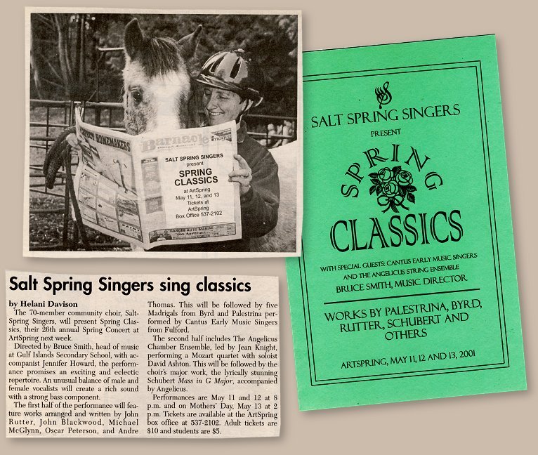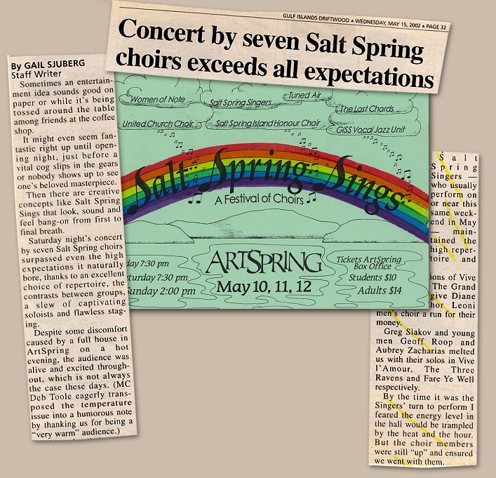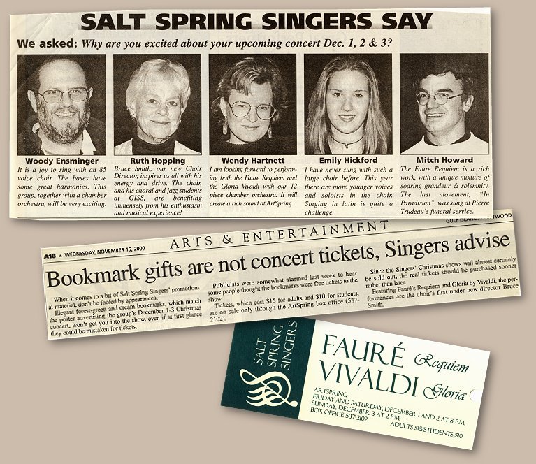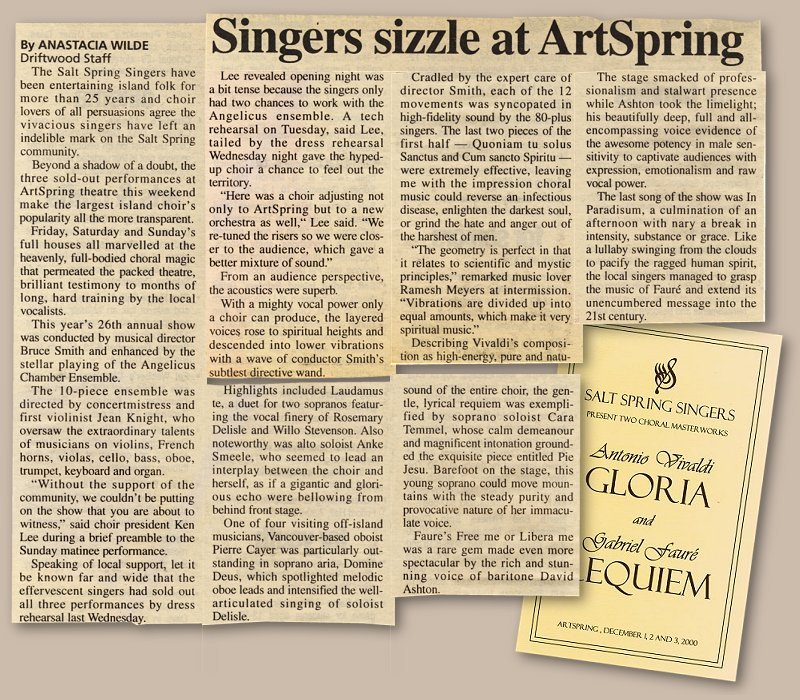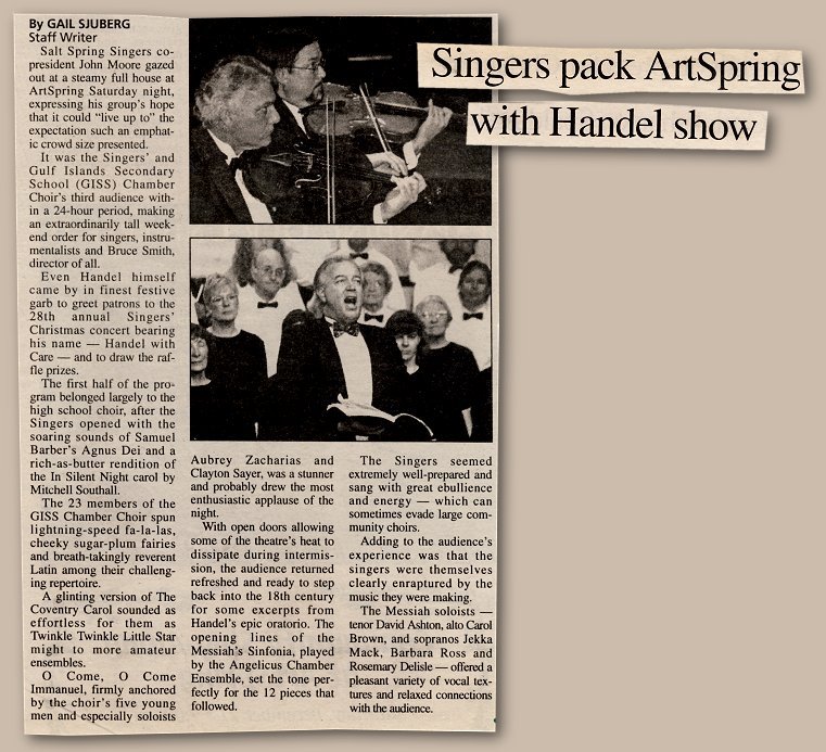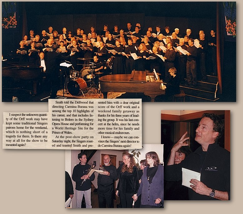 Bruce Smith came to us from the Gulf Islands High School where he taught music. Each year, he squeezed musical excellence out of the high school choir(s), and he did no less with the Salt Spring Singers. He was more demanding of us, and somehow we rose to the challenge. Musical highlights included performing Faure’s Requiem, and Karl Orff’s Carmina Burana.